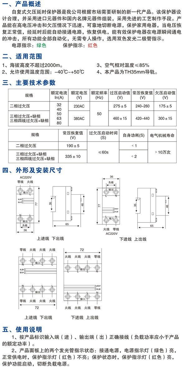 一、概述 當380V額定電源電壓上升到450V±5V或下降在300V±5V時,迅速可靠的切斷電路,電壓正常時延時2-4min通電,實現線路保護。